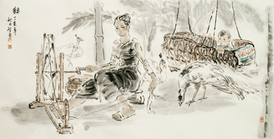 胡智勇早年从写生入手,后参照临习徐悲鸿、蒋兆和、黄胄等大家的现代水墨人物画,并系统地学习了人物造型和传统笔墨方法。经过长期的创作实践,逐步形成了造型严谨生动、笔墨洒脱豪放、生活气息浓郁的绘画风格。此次展出的西双版纳——傣女系列作品,是他近年来关注南国风情系列作品的一个小系列。画家以挥洒自如而不失精妙的笔墨,表现了傣族女子泼水的欢快和曼妙,以及她们在果园劳作的甜美和阳光。