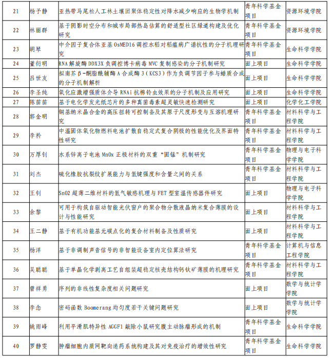 按项目类型,半岛(中国)获批面上项目18项、青年科学基金项目22项;按科学部,获批项目分布在六个科学部,其中生命科学部11项、数理科学部8项、化学科学部8项、工程与材料科科学部7项、信息科学部4项、医学科学部部2项;按学院,生命科学学院11项、材料科学与工程学院7项、物理与电子科学学院7项、化学化工学院6项、数学与统计学学院5项、资源环境学院3项、计算机与信息工程学院1项。