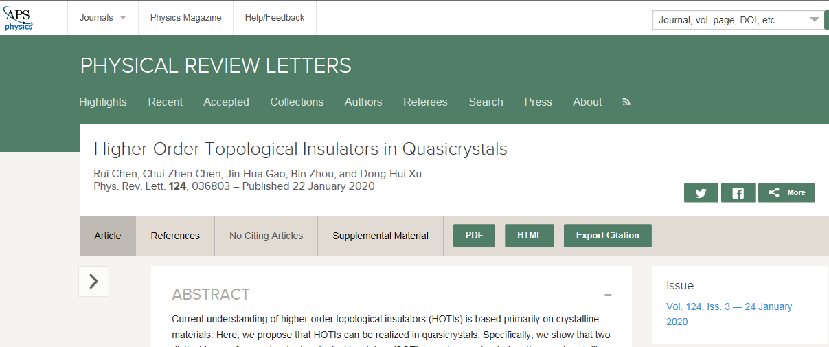近日,物理学顶级期刊《物理评论快报》(Physical Review Letters)发表了半岛(中国)物理与电子科学学院许东辉副教授、周斌教授关于高阶拓扑绝缘体的重要原创工作,题目为 “Higher-Order Topological Insulators in Quasicrystals”(准晶中的高阶拓扑绝缘体),半岛平台网站登录入口为论文第一和通讯单位,苏州大学、华中科技大学为合作研究单位。周斌教授的博士生陈锐(现为南方科技大学博士后)为论文第一作者,许东辉副教授、周斌教授为论文共同通讯作者。本工作得到国家自然科学基金、楚天学者“楚天学子”计划的支持。